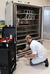 Benjamin Ruß von Kraus Hardware bei der Prüfung der Kälte-Wärme-Kammer.Kraus Hardware
